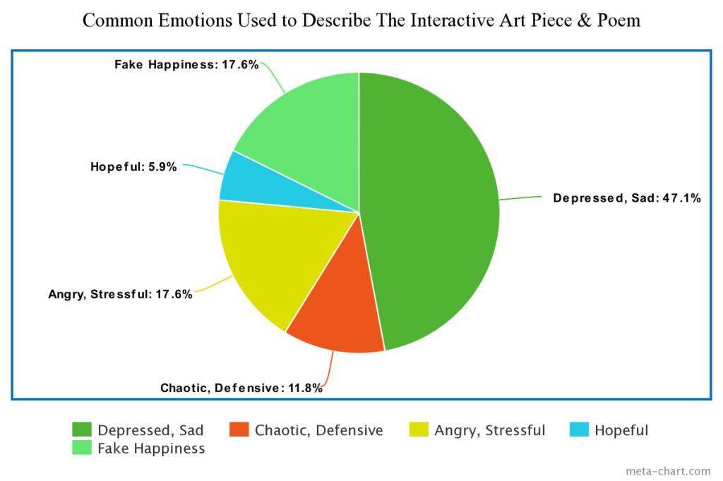 Below you will see another pie chart that displays the common emotions used to describe the interactive art piece and poem by the participants after they listened to/read the poem. As you can see almost half of the participants described the art piece and poem together to be sad and/or depressive. You can see that the percentage of feeling angry or stressed has increased by 5.8 precent. An emotion described as “fake happiness” was also mentioned a lot among responses, the participants didn’t have an exact word for it and neither did I but collectively, we knew what that feeling was.